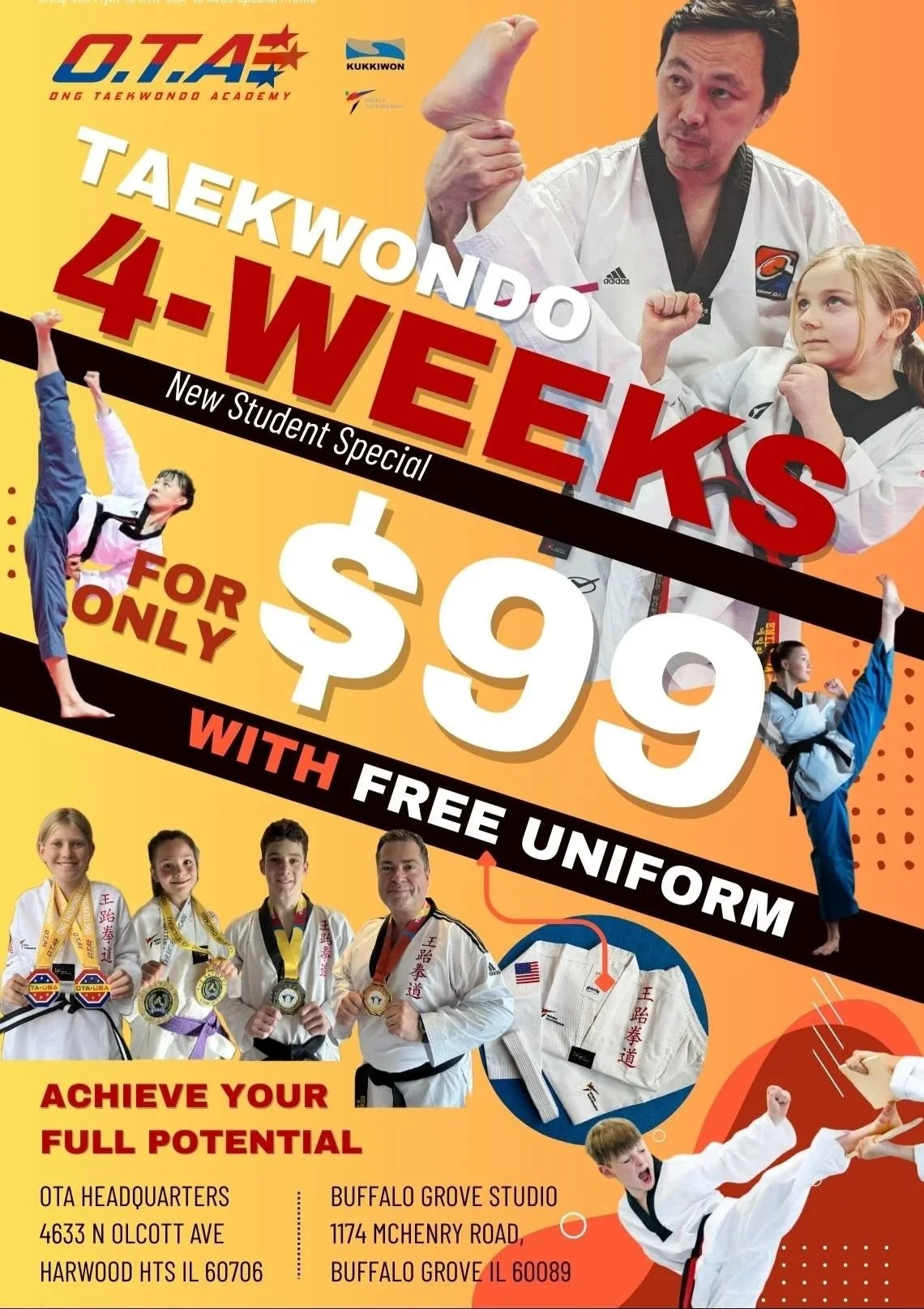 For a limited time, simply purchase the Official OTA Uniform for just $70, and you'll receive a complimentary month of Taekwondo classes, every Tuesday or Friday from 6:15 PM to 7:00 PM.